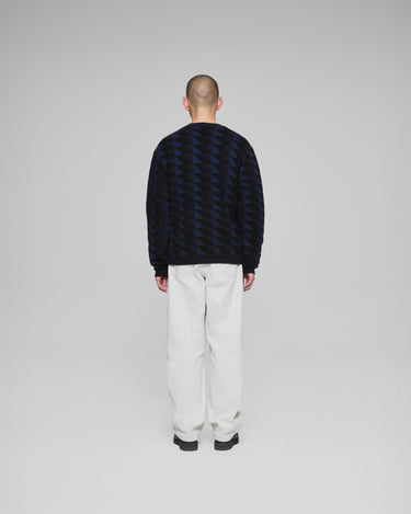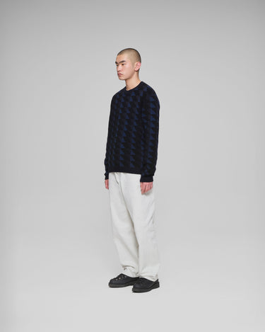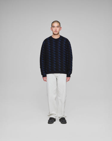 グラフィック柄のクルーネックニット 弾力性がある編み地でハリ感のあるシルエット。
